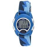 The Timex T70981 Youth digital watch is reliable, durable, and readable in the dark, thanks to the integrated Indiglo night-light, but it's also flat-out fun to wear. It features an easily readable digital display with large, recognizable icons for the chrono, alarm, and timer functions, and a comfortable elastic fabric strap (for better dirt and stain resistance) with blue lightning bolts against a multi-tone blue base. This watch also offers water resistance to 30 meters (99 feet), 12/24-hour time, durable blue resin case, large function buttons, and Timex's unique Kids Loss Protection Plan. It's recommended for children ages 6 and older.