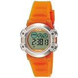 The Activa Women's Multi-function Digital Watch #AD007-002 is both sporty and stylish, perfect for the athlete who wants a timepiece that is fun, functional, and fantastically feminine. The bright orange plastic band is lightweight and durable. It complements a circular brushed-silver bezel which is accented by four brushed silver, oversized, easy-to-push function buttons. The digital green dial features black, oversized digital numbers and geometric-shaped digital designs to show its various functions, including an alarm, stopwatch, and day and date calendar. This watch is water resistant to 165 feet.