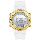 Sport watch, Digital movement featuring chronograph with 10-lap memory, Digital timer, Dual time zone display, Alarm function, Push-button backlight, Positive (dark-on-light) digital numbers, Digital day-date-and-month, Polished gold-tone metal bezel etched with minutes indicator, White polycarbonate large round case with gold-tone selector buttons, Stainless steel caseback, 50 meters/165 feet water resistant