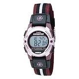The Timex Women's Expedition Chronograph Watch #T49659 enhances the outdoor experience with its blend of classic design and advanced technology. And with its handy chronograph feature, this timepiece delivers on-demand information at the click of a button. A stationary polyurethane bezel and durable acrylic window encase and protect the digital-gray dial face. Accented with attractive maroon highlights, the 33-millimeter case is made of rubber, and the sporty canvas band and buckle clasp ensure grace and comfort. Other features include its day, date, and month calendar. It's water resistant up to 330 feet. This watch is powered by digital-quartz movement.