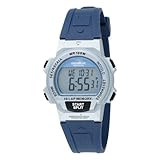 Featuring a sleek design and multiple functions, the Timex Midsize Ironman Watch offers two time zones, 10-lap memory recall, stopwatch with lap and split times, and a top pusher for easy operation. The durable resin case melds with the blue resin band that wraps comfortably around the wrist and fastens with a classic buckle for an adjustable fit. With blue accents framing the curved, rectangular, gray dial, this versatile watch displays day, date, and month information. A strong mineral crystal protects the dial from scratches and scrapes, and this high-performance timepiece is water resistant to 330 feet (100 meters).