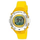 The Activa Midsize Multi-function Digital Watch #AD044-007 is both sporty and stylish, perfect for the athlete who wants a timepiece that is both fun and functional. The bright yellow plastic band complements a circular silver-tone bezel which has function words such as illumination, start, reset, mode and light around it. The digital green dial features black, oversized digital numbers and contrasting gray numbers that show seconds. The dial also features geometric-shaped digital designs to show its various functions, including an alarm, stopwatch, and day and date calendar. This watch is water resistant to 165 feet.