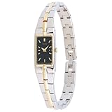 With its slim, artistic profile, this Seiko Women's Watch is a versatile addition to any wardrobe. Featuring a black rectangular dial, gold-tone hands, and stick indices, all protected by a hardlex crystal and framed by a gold-tone band on a silver-tone brass bezel, this timepiece utilizes reliable Japanese quartz movement. Its 13-millimeter case and 9-millimeter bracelet band with jewelry clasp are precisely crafted from brass and finished in silver- and gold-tones. This watch is water resistant to 99 feet.