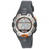Keep your sports training focused with this mid-sized, shock-resistant Timex Ironman Triathlon multi-function sport digital watch (model 5H031), which features a 30-lap memory and the unique hands-free Flix Indiglo activation system. It features a durable dark gray resin case, silver stainless steel top ring and large buttons for easy access to timing functions. It also offers a 6-year battery life, water resistance to 200 meters (660 feet), three alarms (with 5-minute backup), and three time zones. Other features include a top pusher (in orange) for easy access to lap and split times, and all-day white reflector display. Sport timing functions include: