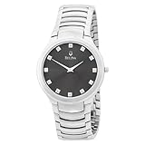 A sophisticated classic in stainless steel, this Bulova dress watch showcases a perfectly round steel case on a handsome link bracelet that fastens with a hidden deployment clasp.Twelve genuine diamond hour markers add a note of luxury to the charcoal patterned dial, which features sleek tapered silvertone hands.The dial is capped with a mineral crystal and framed by a round steel bezel.This Bulova watch features precise Japanese quartz movement and is rated water resistant to 30 meters.
