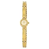 Complement your contemporary couture with this gold-tone Bulova women's stainless steel dress watch, which features a slender, artful bangle-style stainless steel bracelet. It features a perfectly round watch case that measures a petite 12mm wide (0.47 inches). It has a curved, slightly raised bezel that frames a champagne dial face complemented by a mix of tiny gold-tone stick and dotted markers and silver hands. This precise quartz timepiece also features a scratch-resistant mineral crystal and water resistance to 30 meters (99 feet).