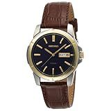 This Classic Seiko Men's watch features a brown leather strap with buckle clasp which is emphasized by a stainless steel case with gold tone accents. The blue dial features a day/ date display and luminous hands and markers for night-time visibility. 100 meters water resistant.