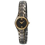 The Seiko Women's Dress Black Ion Watch is designed with beautiful black-ion-plated-stainless-steel materials with gold-tone accents, for a sleek satin on steel appearance. Constructed with a black-ion-plated-stainless-steel case, the timepiece includes a gold-tone-stainless-steel bezel, and a two-tone-stainless-steel link bracelet with a push-button clasp. A curved hardlex window shields the black dial face, which features gold-tone Roman numeral hour markers at six and 12 o'clock, as well as gold-tone watch hands. Powered by Japanese-quartz-movement, this timepiece is water resistant to 99 feet. It is presented in a luxuriously padded Seiko case.