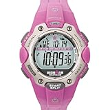 This rugged, feature-laden watch from Timex bears the moniker of one of the most grueling races known to man, the Ironman Triathlon. It may be inconceivable that any watch would be expected to function while its owner swims 2.4 miles, bikes 112, and runs 26.2 miles. But this watch was made to excel in such conditions. Features include an Indiglo night light with the flix, hands-free function, a 100-hour chronograph, a 99-lap counter, shock resistance to ISO standards and 30-lap recall. For the triathlete who enjoys a good round of golf, the watch also sports a golf score keeper. Water resistant to 660 feet (200 meters), and powered by digital quartz movement, the watch also has a pink resin band, a stainless steel case, and a pink resin bezel. It is backed by a 1-year manufacturer's warranty.