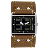 Free Standard Shipping Over $100. An eye-catching accessory to your favorite casual ensemble. Brown metallic dial is set in a light stainless steel case. Black genuine leather strap features silver tone accent squares and provides a comfortable fit. Case Size: 39 mmCase Thickness: 10 mmBand Width: 41 mmWater Resistant: Up to 5 ATMWarranty: 11-year limited Origin: Imported