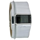 A fashion-forward design from Diesel. Watch features a silvertone patent leather cuff and stainless steel mirror case. LCD display dial. Water resistant to 50 meters. Quartz analog movement. Two-year limited warranty.