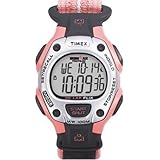 Keep your sports training focused with the sporty, petite-sized Timex T5G251 Ironman Triathlon multi-function, performance sport digital watch, which features a deep red Indiglo night-light as well as the hands-free Flix Indiglo activation system. It features a durable coral and silver resin case, large buttons for easy access to timing functions, and a nylon Fast Wrap strap (with Velcro fastener). It also offers a 6-year battery life, water resistance to 100 meters (330 feet), three alarms, and three time zones. Sport timing functions include: