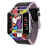 The eye-catching features of the 01TheOne Unisex Split Screen Romero Britto Art Pink Watch create a high-fashion artsy timepiece. Exclusive art designed by the internationally renowned artist Romero Britto decorate the bezel and dial. The bezel and case of the watch are made of high-grade stainless steel for long-lasting endurance. A blue dial features a vibrant enamel art inlay that is sure to grab attention everywhere you go. Binary time and date are digitally displayed 'split screen' style on each side of the enamel inlay with white Arabic numerals and red LED lights illuminating the time against a black background. The black pigskin leather band is accented with a pink leather lining and securely fastens with a buckle clasp. This timepiece features reliable Japanese quartz movement and is protected by a durable mineral crystal window. This fashionable timepiece is water resistant to a depth of 99 feet (30 meters).
