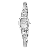Featuring a narrow, stainless steel bracelet, the Caravelle by Bulova Women's Swarovski Crystal Accented Silver and White Dial Watch is delicate and dainty enough to double as a dress bracelet. The cushion-shaped, textured silver dial features pearlized dots as hour indexes and silver-toned hands. It's framed by a silver-toned bezel and a sturdy case. The slim bracelet is connected to the dial by a stylish link that's embedded with Swarovski crystals for a unique look. The silver-toned bracelet is secured by a jewelry clasp for added protection. The Caravelle by Bulova Women's Swarovski Crystal Accented Silver and White Dial Watch is equipped with reliable Japanese quartz movement and is water resistant to 99 feet (30 meters).