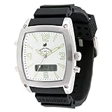 Sporting a balanced look between sporty and polished, The Field & amp; Stream Men's Pathfinder Dual-Time Zone Watch features an athletic, black rubber band that joins to a stylish, tonneau-style stainless steel case. A screw-down bezel frames a crisp, white dial that offers black stick minute markers, luminescent hour indicators in a mix of Arabic numerals and bars, luminescent hands, and a digital time display. Easy-to-operate push pieces enhance the convenience of this handsome, versatile watch. The Field & amp; Stream Men's Pathfinder Dual-Time Zone Watch is water resistant to 99 feet.