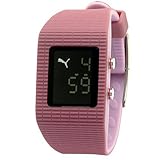 Stylishly spare and modern, this mid-sized Puma digital watch is a great choice for wearing during workouts or sweating it out on the dance floor and is suitable for both men and women. It features a fashionable one-piece plastic case and tapered strap with a grooved accent, with pink on top contrasted by light lavender on the reverse. The negative white-on-black digital display offers large, easily readable numerals, with the hour sitting atop the minutes. It's further accented by Puma's signature pouncing cat. Take it to the beach without any worries thanks to water resistance to 100 meters (330 feet)--offering protection from accidental splashes as well suitable for swimming, snorkeling, and light recreational diving.